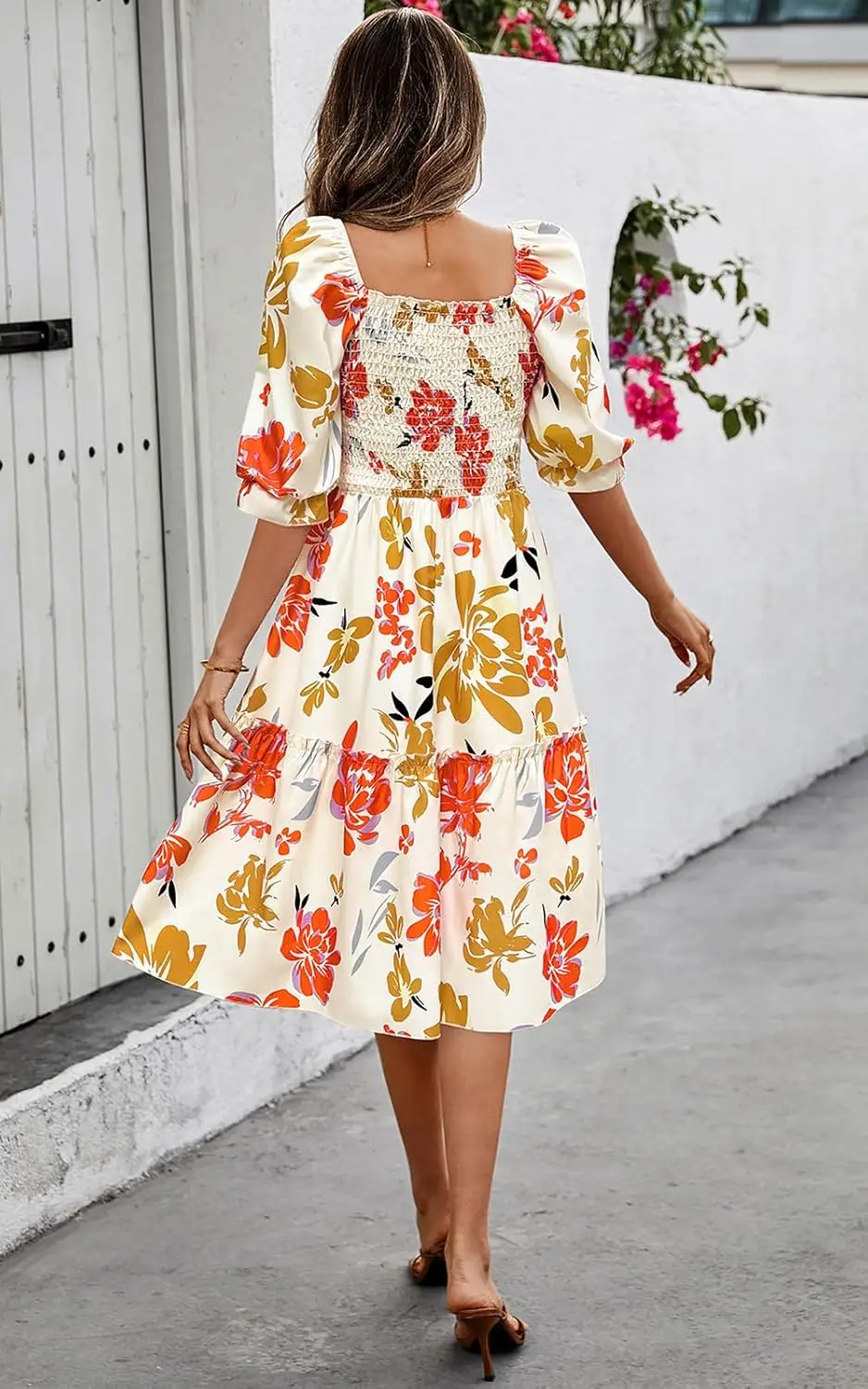 2025 Women's Summer A-Line Midi Dress Square Neck Floor-Length Puff Sleeves Empire Flowy Boho Floral Smocked Casual Made Chiffon